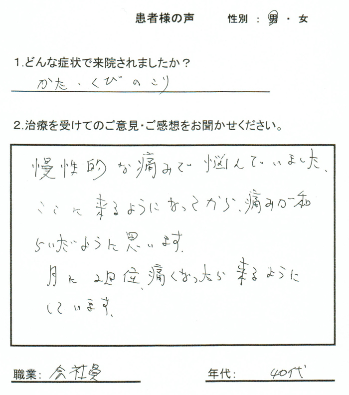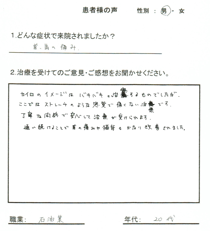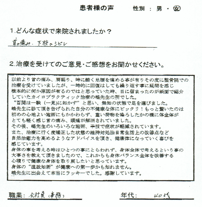 以前より首の痛み、肩こり、時に酷く足腰を痛める事が有りその度に整骨院での治療を受けていましたが、一時的に回復はしても繰り返す事に疑問を感じ根本的に何か原因が有るのではと思っていた時、目に留ったのが紙面で紹介していたカイロプラクティック治療の先生の所でした。