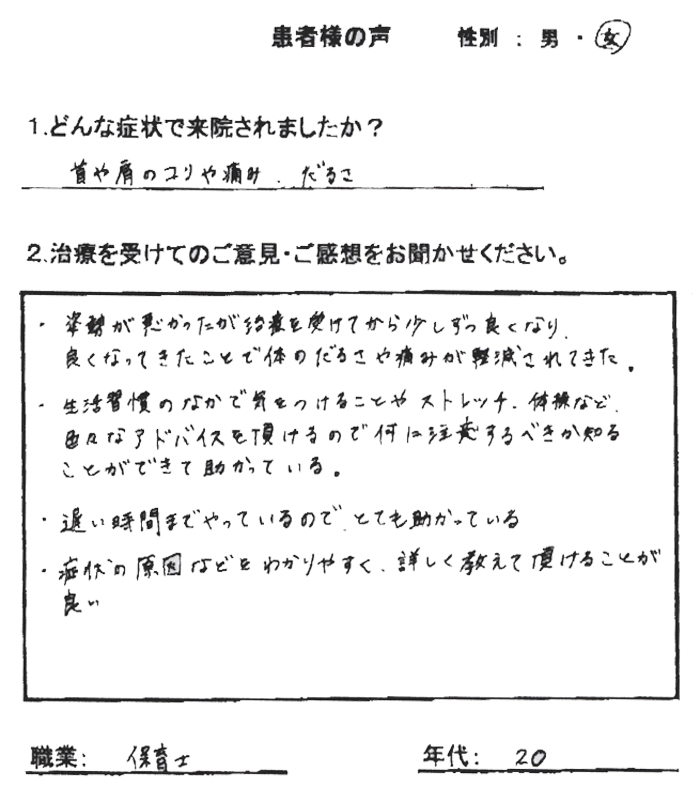 また、治療に行く度矯正した状態の維持対処法日常生活上の改善点など、自然治癒力を高めるようなアドバイスを頂き、健康体になっていく喜びを感じています。