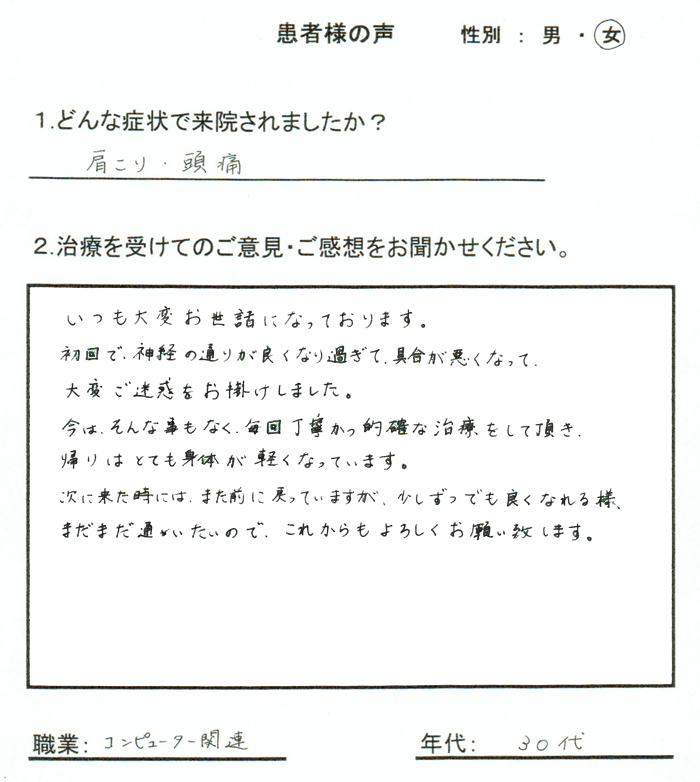 嶋先生に診て頂き告げられた自分の不健康な体にビックリ!もっと驚いたのは初めの心地よい施術にもかかわらず、重い荷物を降ろしたかの様に体全体がとても軽く感じ首の痛み、頭痛が解消されていました。