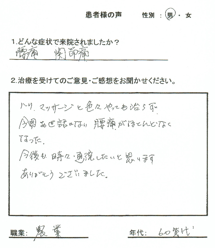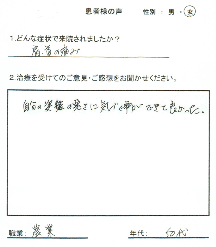 身体の事を考える時はひとつの事にとらわれず、身体全体で考えるという事の大事さを教えて頂きましたので、これからも身体バランス全体を改善する心積りで健康な身体を取り戻したいと思っています。